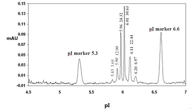 圖:蛋白質(zhì)藥物pI點(diǎn)的準(zhǔn)確測定(均一性研究)