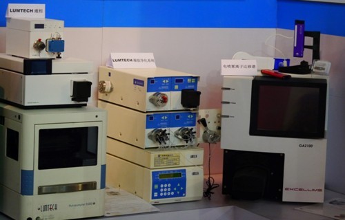 (上圖自左到右:綠綿科技在BCEIA2013展出液相色譜儀LUMTECH、GPC凝膠凈化前處理和液相離子遷移譜實物)