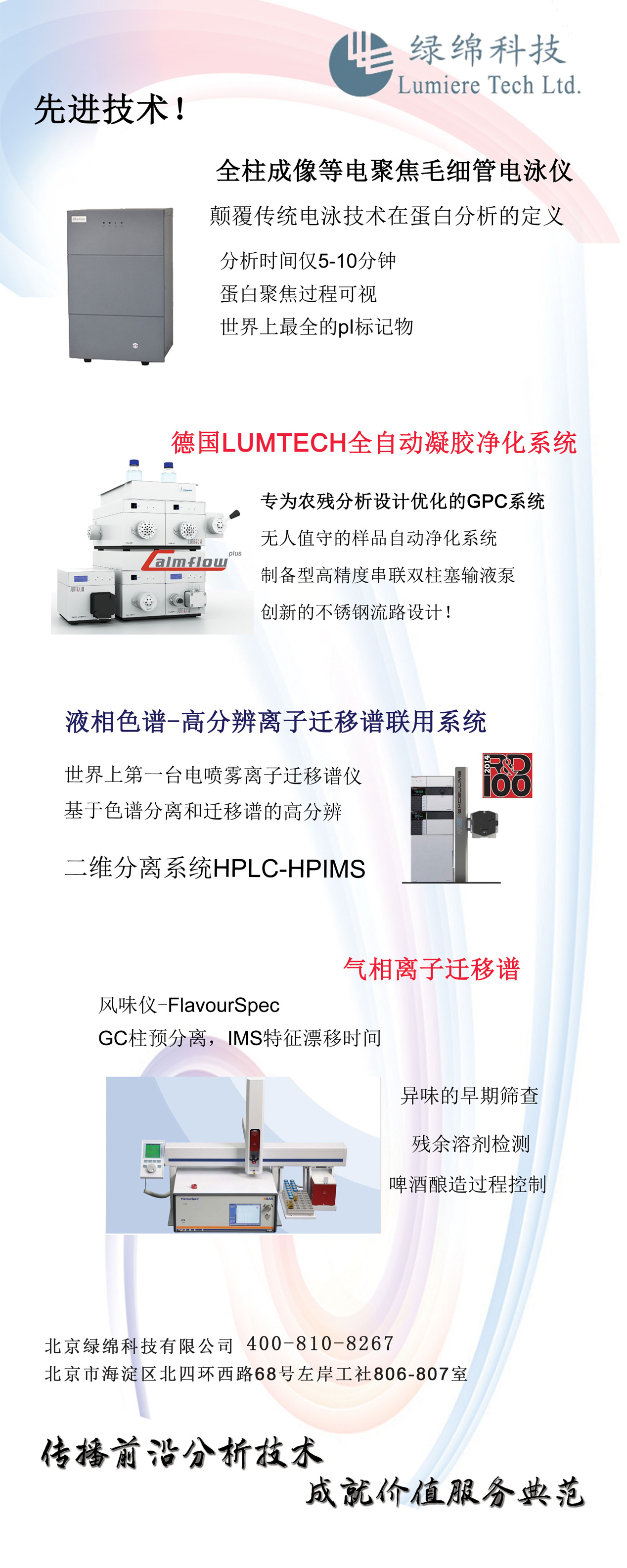 北京綠綿科技有限公司(簡稱:綠綿科技)以體現(xiàn)客戶服務(wù)高價(jià)值為宗旨,以專業(yè)精神和技能為廣大實(shí)驗(yàn)室分析工作者提供樣品前處理、樣品制備及分析、實(shí)驗(yàn)數(shù)據(jù)分析和管理的全面解決方案,致力于協(xié)助客戶提高分析檢測的效率和水平。主要代理產(chǎn)品有LabOS實(shí)驗(yàn)室運(yùn)營系統(tǒng)、Lumtech半制備/制備液相色譜、Massworks準(zhǔn)確質(zhì)量測定及分子式識別、New objective納噴離子源、GE生命科學(xué)設(shè)備、凝膠凈化前處理、氣相離子遷移譜、電噴霧離子遷移譜、全柱成像毛細(xì)管等電聚膠電泳儀、實(shí)驗(yàn)室氮?dú)鈿錃饪諝獍l(fā)生器、Agilent中端產(chǎn)品。