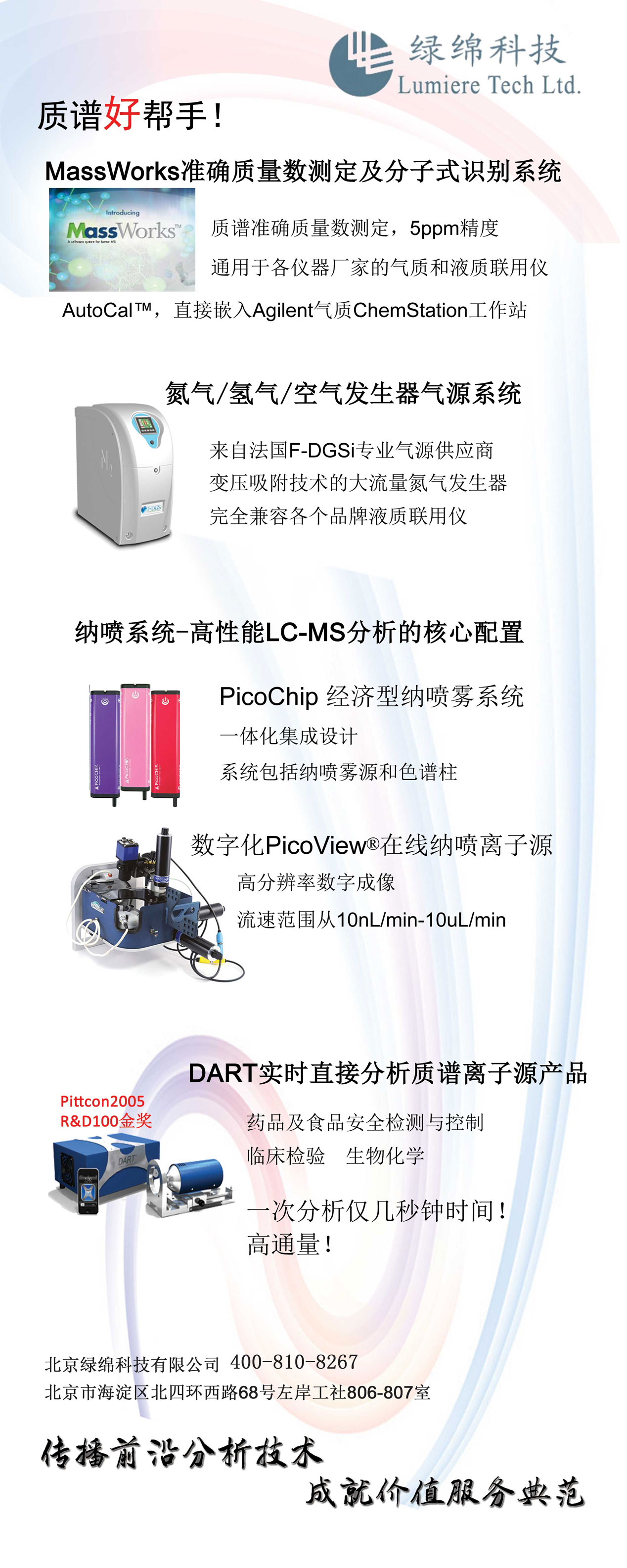 四、綠綿科技在2014第三屆環(huán)渤海區(qū)域色譜質(zhì)譜學(xué)術(shù)會議展出質(zhì)譜好幫手:安捷倫科技旗下GC/MSD系統(tǒng)上配置Cerno Bioscience校正和分析軟件MassWorks,綠綿科技推出的實(shí)驗(yàn)室氣源系統(tǒng)可以給所有廠家液質(zhì)提供穩(wěn)定的氣源,PicoChip一體化集成設(shè)計(jì)完整經(jīng)濟(jì)的納噴霧系統(tǒng),PicoChip系統(tǒng)包括PicoChip納噴霧源和PicoChip色譜柱,數(shù)字型PicoView®納噴離子源數(shù)字控制消除了手動(dòng)噴針定位和電壓調(diào)整的繁瑣和偏差,是提升LC-MS性能的利器,DART基本不需要樣品制備,樣品分析時(shí)間很短(幾秒鐘),滿足了現(xiàn)代社會對高通量樣品快速分析的需求。