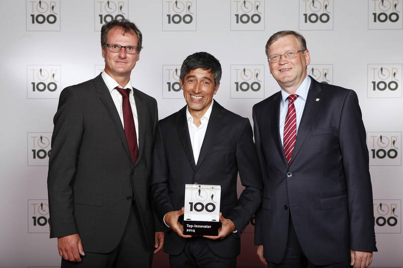 (Stefan Leiser (左)和Dr. Serge Mell (右)從著名的學(xué)者及電視主持人Ranga Yogeshwar(中) 手中接過(guò)TOP 100獎(jiǎng)杯)
