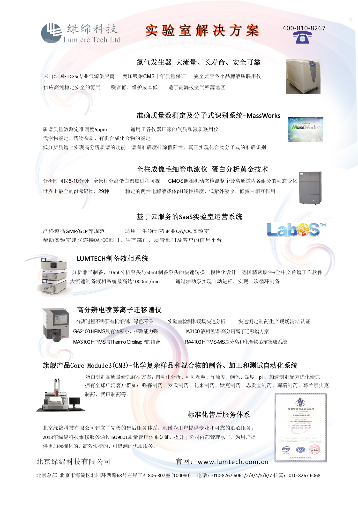北京綠綿科技有限公司(簡稱:綠綿科技)成立于2001年,以體現(xiàn)客戶服務(wù)高價(jià)值為宗旨,以專業(yè)精神和技能為廣大實(shí)驗(yàn)室分析工作者提供樣品前處理、樣品制備及分析、實(shí)驗(yàn)數(shù)據(jù)分析和管理的全面解決方案,致力于協(xié)助客戶提高分析檢測的效率和水平。主要代理產(chǎn)品有LabOS實(shí)驗(yàn)室運(yùn)營系統(tǒng)、Lumtech半制備/制備液相色譜、MassWorks準(zhǔn)確質(zhì)量測定及分子式識別、New Objective納噴離子源、GE生命科學(xué)設(shè)備、凝膠凈化前處理、氣相離子遷移譜、電噴霧離子遷移譜、全柱成像毛細(xì)管等電聚膠電泳儀、實(shí)驗(yàn)室氮?dú)狻錃?、空氣發(fā)生器、Agilent中端產(chǎn)品。服務(wù)熱線:400-810-8267,郵箱:[email protected]。