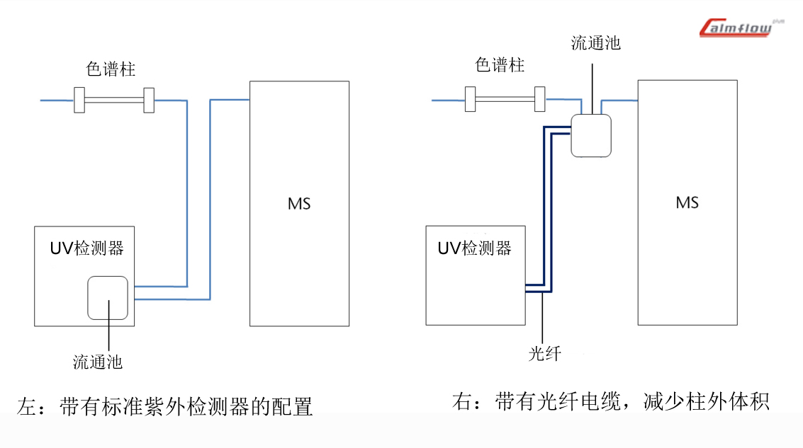 帶有光纖電纜的流通池在與質(zhì)譜的連接中,可以顯著減少柱外體積,因此提高峰型。