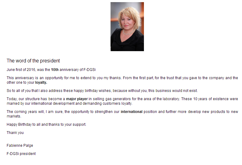 2016年6月1日,F(xiàn)-DGSi成立10周年,總經(jīng)理Fabienne Palge在祝福語中表達感謝,感謝給予的忠誠信任,F(xiàn)-DGSi已經(jīng)成為實驗室氣體發(fā)生器的主要的供應(yīng)商,十年的發(fā)展和生存預(yù)示著F-DGSi有很好的國際合作和客戶的忠誠度,今后還會繼續(xù)擴展國際合作和拓展新市場新產(chǎn)品。