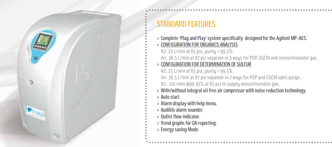 法國(guó)F-DGSi(法德賽)生產(chǎn)的THYSTER系列氮?dú)?空氣發(fā)生器是專為Agilent_MP-AES設(shè)計(jì)“即插即用”的氣源系統(tǒng),采用雙氣體流路設(shè)計(jì),采用變壓吸附技術(shù)分離產(chǎn)生純度大于99.5%的氮?dú)庖詽M足MP-AES 4100/4200/4210的用氣需求,同時(shí)又通過(guò)活性氧化鋁分離技術(shù)同步產(chǎn)生純凈空氣以滿足POP、EGCM、Monochromator空氣用氣需求,還可以具備純度達(dá)到99.95%的氮?dú)庥糜诹蚍治鐾ǖ赖膍onochromator gas。