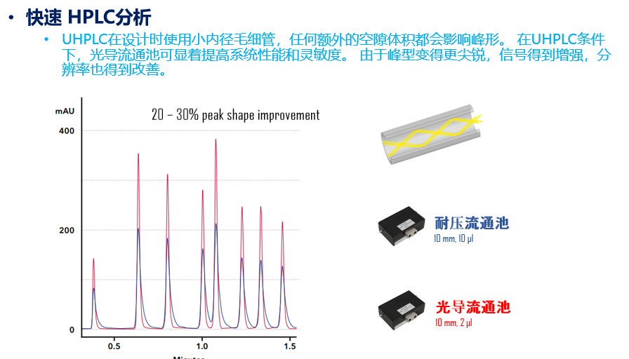 AZURA® 采用波長190-700nm的DAD 2.1L二極管陣列檢測器,搭配高靈敏度的分析流通池以適應(yīng)不同的檢測需求,如用于常規(guī)HPLC分析的耐壓流通池和標(biāo)準(zhǔn)型光導(dǎo)流通池,用于UHPLC分析的高靈敏度光導(dǎo)流通池等。