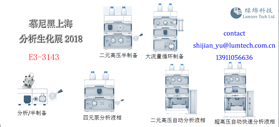 在第八屆慕尼黑上海分析生化展上,綠綿科技推出液相優(yōu)惠促銷活動,有兩款LUMTECH制備液相(二元高壓半制備液相、大流量循環(huán)制備液相),四款KNAUER分析液相系統(tǒng)(分析/半制備液相、四元手動液相、二元高壓自動液相、超高壓自動液相),超值性價比的德國原裝液相分析/制備系統(tǒng),具有可升級功能,德國品質(zhì),不可錯過,歡迎光臨!
