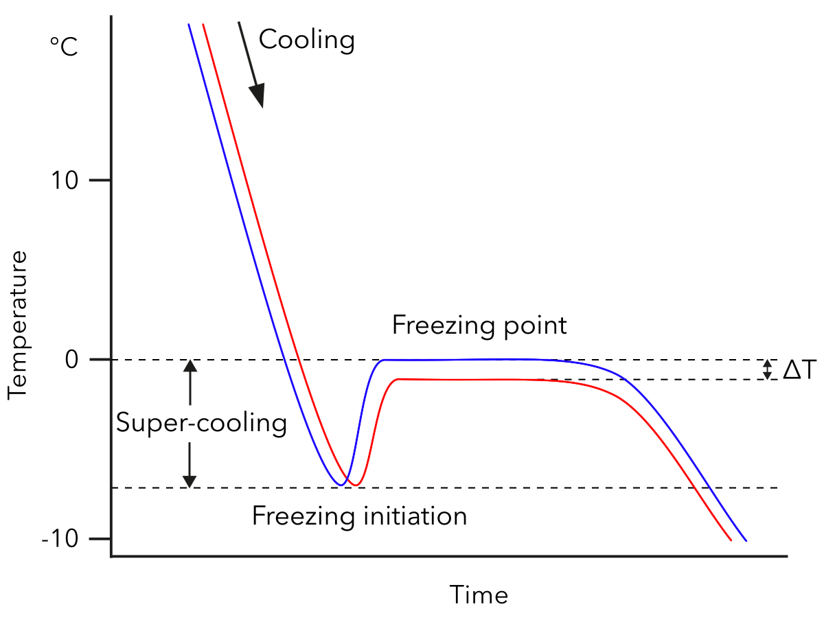 藍色線條代表純水,紅色線條為牛奶,△T即為牛奶的實測冰點值