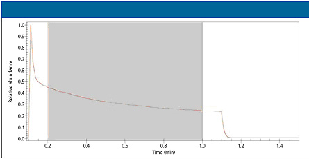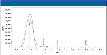 EI廣泛用于氣相色譜-質譜(GC-MS),在EI過程中,分子離子常常被碎裂成多個碎片離子,盡管樣品所測得的質核比(m/z)和譜庫比較僅有±0.5 Da準確度,但這些EI碎片離子通過譜庫檢索(如NIST)可以提高MS的化合物識別能力,因此,EI譜庫檢索已經成為GC-MS化合物識別的選擇方法。雖然該方法可以很好地滿足一些日常應用,但如果很多化合物具有相似的高檢索分數(shù)時,化合物識別就變得含糊不清了。在一些苛刻應用中,如雜質和降解物識別,藥物、化學品、食品和香精、香料行業(yè)中的活性組分測定,這些不明化合物可能不在譜庫中,因此,這類應用就需要高分辨質譜系統(tǒng)如GC-TOF測量質量數(shù),這類儀器是非常昂貴的,而且需要更高的維護費用。質量測定可以進一步確定譜庫搜索結果,或通過分子離子及重要的碎片離子確定元素組成。 在另一篇文章中,Chen及其團隊[1]報道了通過新的校正方式,精密地校正了m/z和質譜的線形譜圖,在傳統(tǒng)四極桿GC-MS系統(tǒng)上實現(xiàn)了極高的質量測定。由于這個精密設計的校正方式涉及質量準確度和譜圖準確度,關于這個校正及其實際應用的穩(wěn)定性問題隨之出現(xiàn)。 本文針對傳統(tǒng)單四極桿GC-MS系統(tǒng)元素組成識別的影響因素,質量準確度和譜圖準確度兩個方面,設計一個校正穩(wěn)定性研究程序并將結果展現(xiàn)給大家。 原理 傳統(tǒng)的質譜校正僅確定質量數(shù),而不考慮儀器線形譜圖,儀器線形譜圖大大影響質量數(shù)測定,特別是在單位質量分辨儀器如四極桿GC-MS系統(tǒng)。開發(fā)的新校正方式[2, 3]不僅校正了質量軸,而且也校正了儀器的線形譜圖,由于質譜的理論峰位(它們是相關離子的質量和)可以非常準確的知道,另外,我們也可以準確地知道不同同位素及其豐度,通過這些信息可以計算出校正函數(shù),不但校正峰的位置,而且也校正儀器的線形譜圖。 實際儀器的線形譜圖常常是未知且很難定義,通過這個新技術校正后,變成對稱且可用數(shù)學表達的線形函數(shù),這就大大提高了后續(xù)處理能力,包括在單四極桿GC-MS儀器上質量數(shù)測定能力。通常來說,利用報告的質量信息,在一定的質量偏差內,通過搜索全部可能的化學分子式可以確定元素組成。依賴儀器內在的質量準確度,在質量偏差范圍內得到的分子式均為可能的分子式,如質量準確度達到1 ppm的儀器,對于500 Da的化合物,限定元素為C、H、N、O、S和Cl時,待選的化合物有34個。 眾所周知,每個分子式具有的同位素分布,理論上來說,這個同位素分布可作為分子式識別的附加信息。以前,這個方式用于分子式識別被認為是不可行的,因為很難在給定的儀器上將同位素輪廓圖校正到高于98%的譜圖準確度[4],這就限制了使用同位素輪廓圖信息,幫助我們減少通過質量測定得到的待選化合物數(shù)量。然而,如果譜圖準確度能夠提高到99%以上,它就能在質量數(shù)得到可能分子式列表中識別出的分子式,或在不經常校正的儀器上測定確定的分子式,只要能保證相對較高的質量精度。 利用前面描述的儀器校正線形函數(shù),列表中每個待選化合物的理論質譜圖可以準確計算出來,并將其分別與先前校正的測量質譜圖比較,高于99%的譜圖準確度值被計算出來,用于反映兩者微小且基本不同,然后對給出分子式的可能性進行排名,這個過程叫做校正的線形同位素輪廓搜索(CLIPS),已經證明,CLIPS對于分子式測定優(yōu)于質量準確度。 實驗 全氟三丁胺(PFTBA)校正標樣和樣品混合物在Agilent 5973 GC-MS單四極桿系統(tǒng)上測試一周,PFTBA標樣通過注射法測試一次,且在一周后實驗結束時重復測試一次,混合樣品在兩次PFTBA運行中間,以不同濃度分析22次,在這個分析過程中,利用MassWorks CLIPS (Cerno Bioscience, Danbury, Connecticut)測試盲樣(名義質量數(shù)m/z 162)并確定其元素組成。PFTBA和混合樣品在相同MS條件,“raw”模式(非峰檢測,有時叫做輪廓模式)、質量范圍為50-550 m/z且離子閾值為零下采集。 利用次PFTBA運行的八個已知碎片離子,校正全部22次GC-MS運行,并計算盲樣的質量數(shù)并確定元素組成,這個校正也應用到第二次PFTBA運行,測定同樣八個碎片離子的質量,以測定兩次PFTBA運行期間的質量漂移。 結果和討論 圖1顯示了次PFTBA運行的總離子流圖,0.8 min的保留時間窗口用于校正前的譜圖平均。圖2顯示了校正離子C3F5+校正前后的輪廓模式質譜圖,表明雖然經過很好的調諧,但質譜的輪廓圖沒有已知且可定義的峰形,而校正后的譜圖具有已知且可用數(shù)學表達的峰形,校正的質譜圖也根據校正離子的單同位素質量平移到正確的質量數(shù)位置。由于慣例且不失通用性,本文中得失電子的質量差異被忽略,其正確的質量與其離子中性形式一致。