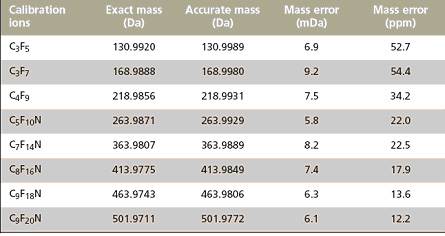 圖2. PFTBA校正離子(C3F5+)校正前(黑)后(紅)的質譜數(shù)據 這個校正被應用在一周后的第二次PFTBA運行上,表I列出了同樣八個校正離子的質量數(shù),可以發(fā)現(xiàn)全部這些離子的系統(tǒng)質量漂移約+7 mDa,折合為12- 54 ppm,這個誤差用于傳統(tǒng)的單一同位素質量搜索確定元素組成常常認為是太大的。 表I. 后一天校正離子PFTBA數(shù)據采集處理后得到的質量數(shù)