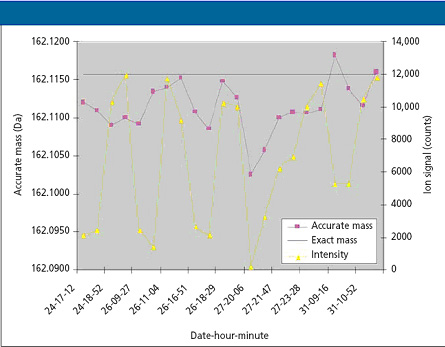 同樣的校正應用到一周內的22次GC-MS運行,圖3畫出了m/z 162離子的質量、離子信號強度以及校正后測定出盲樣(煙堿,C10H14N2)的真實質量,該圖在質量誤差和信號強度之間展現(xiàn)了很明顯的相關性,這個結果也同文獻[5]預測和得到的結果一致。對于強度大于8000 counts,質量與真實質量的偏差在幾mDa以內,這也同表I估算的整個質量漂移一致,確定兩次PFTBA運行所觀察到的整個質量漂移程度相當于相同離子強度重復測試的隨機波動。換句話說,整個系統(tǒng)的~7 mDa質量漂移誤差,相對質量測量本身的隨機波動是沒有統(tǒng)計意義的(次PFTBA校正應用到全部22次GC-MS運行,不會造成重大的系統(tǒng)質量測量誤差)。