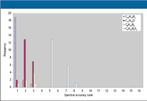 圖3. 報告的質量準確度、單同位素峰離子強度和已知m/z 162 Da的真實質量數(shù) 正象文獻[6]報道,當質量準確度作為分子式識別的重要工具時,通常只識別給定同位素離子的單一同位素峰,由于這個原因,即使具有1-2 ppm質量精度的高分辨質譜,在測量的很小質量誤差內,也有很多待選分子式的單一同位素質量落在這個范圍內。譜圖準確度,一個獨立計量工具,可以計量測定譜圖與計算的理論譜圖匹配程度,它包含給定離子更多的同位素分布精細結構信息,是比質量準確度更重要的信息。另外,由于代表質譜儀器線形譜圖的譜圖準確度不容易受質譜波動影響,所以譜圖準確度相對質量準確度是更可靠的分子識別工具。 162 Da的未知離子,質量誤差超過50 ppm(表I和圖3)提供了很好的例子,說明譜圖準確度相對質量準確度的相對重要性和可靠性。以162 Da離子為未知物,在通常元素C、H、N、O、F和Cl范圍內進行元素組成搜索,全部22次質譜測量利用軟件對這個離子進行處理測定它們的分子式,根據譜圖準確度排名,分子式C10H14N2排名位有19次,兩次排在第二位,一次排在第三位(圖4),這個分子式后來證明是正確的分子式(煙堿),排名第二和三的測量均為樣品濃度較低的情況下得到。